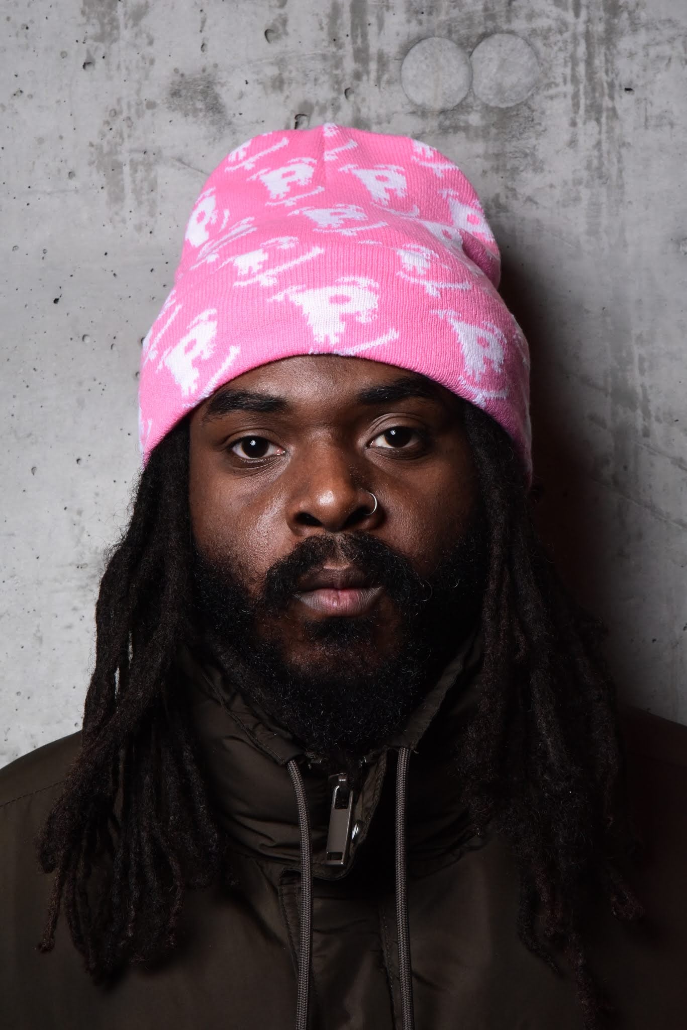 The pink scattered "P" beanie comes with a white "P" logo printed over the entire hat.